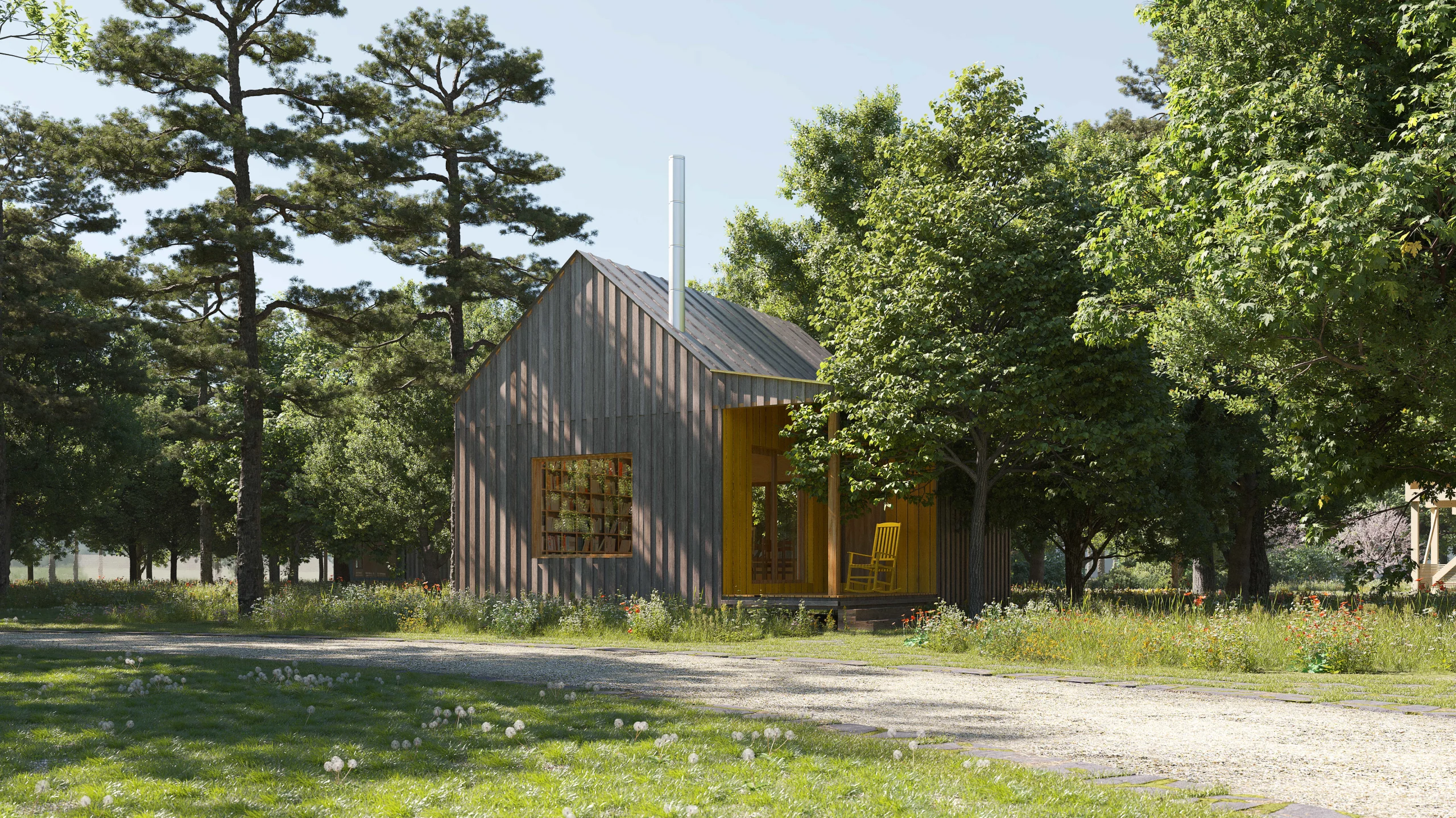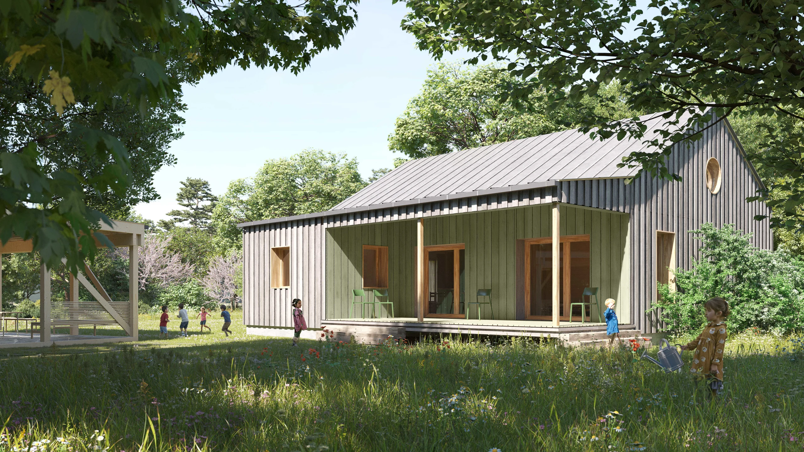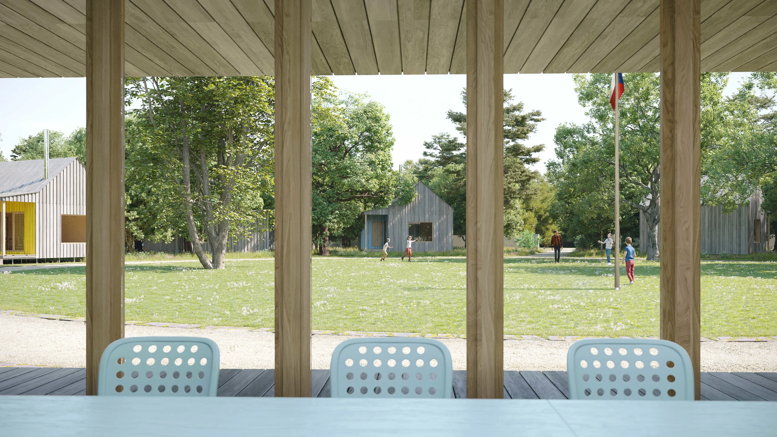 As a unifying architectural element of the buildings, we chose a gabled roof. Partially private verandas, connecting the interior with the exterior, will encourage children and other visitors to participate in outdoor activities. We draw inspiration from the original atmosphere of a quiet and shady oak forest. We aim to restore it by planting mature trees. The greenery will seamlessly transition into the emerging recreational space of the suburban Bažantnice forest.