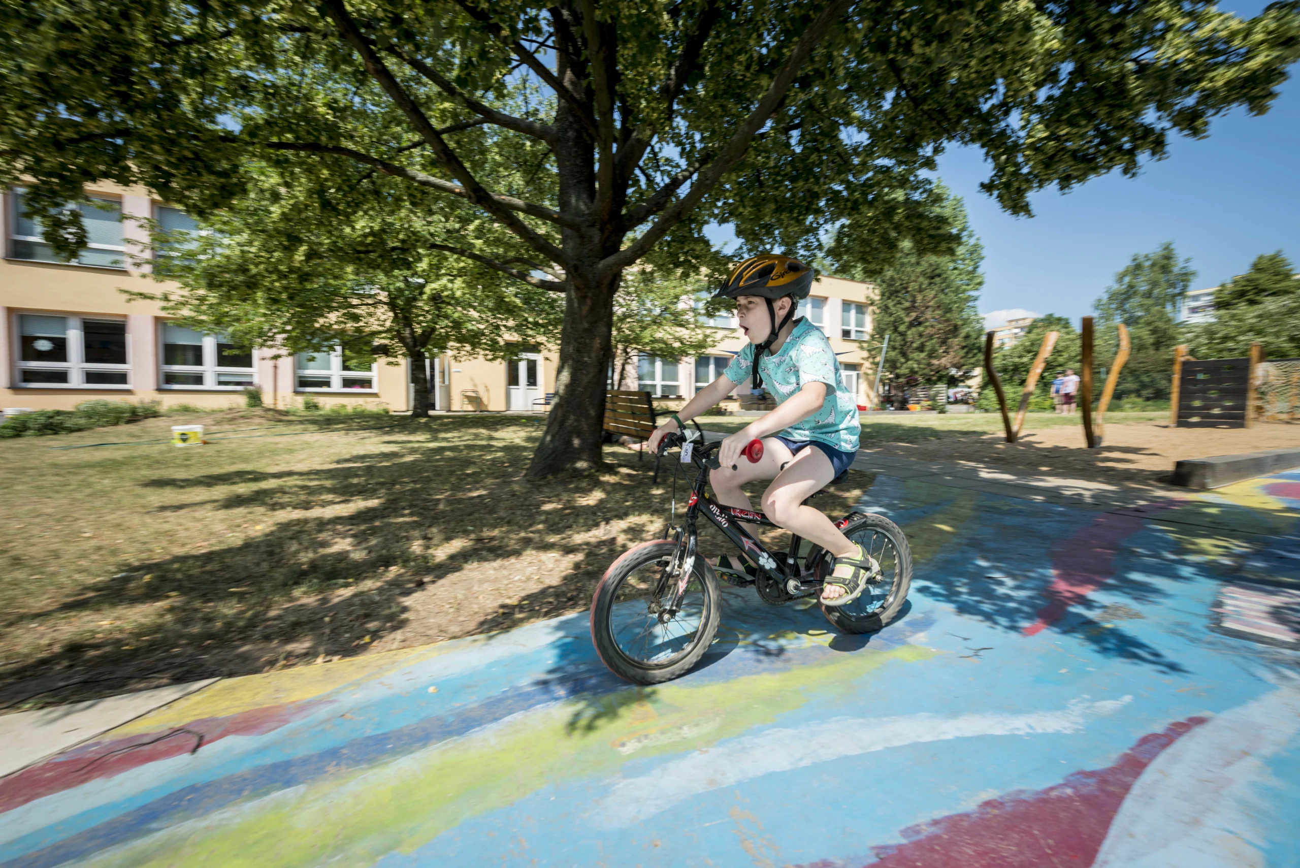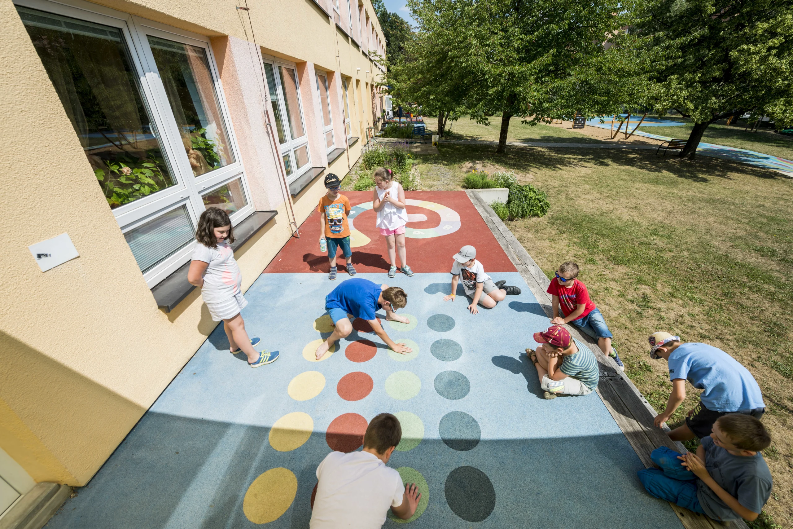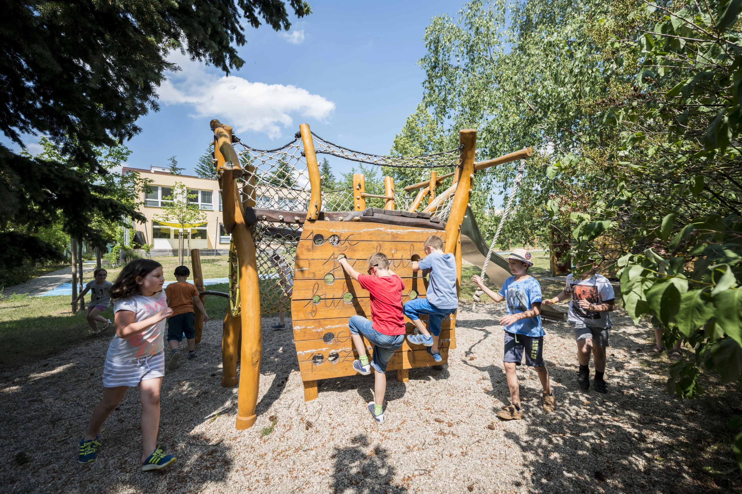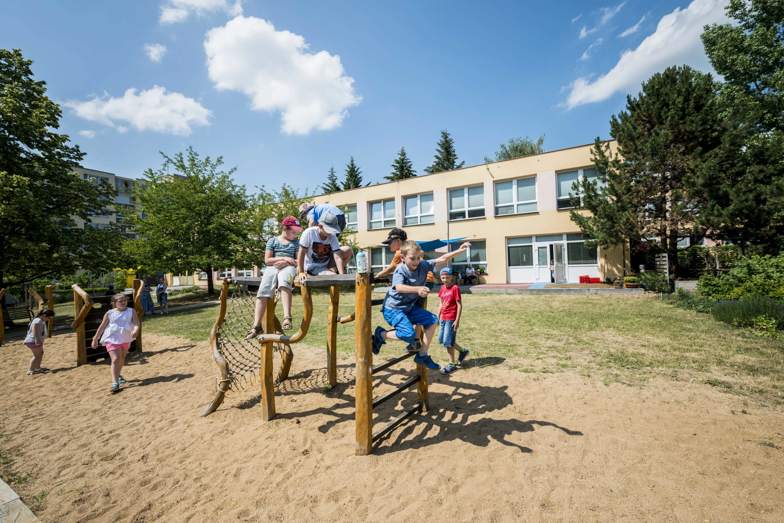 Relaxation, play, well‑designed facilities for outdoor learning, and the opportunity for special education through play and interaction with the environment – these are just some of the benefits the garden now offers after its transformation. We enriched the space with wooden elements co‑designed by visual artist, performer, and sculptor Lenka Klodová, who also created a distinctive feature for the garden: the “Logohut”. Children love spending time in the relaxation zone with balance nets, as well as on the playground and in the sandbox. They also enjoy taking care of the plants in the flower and vegetable beds.