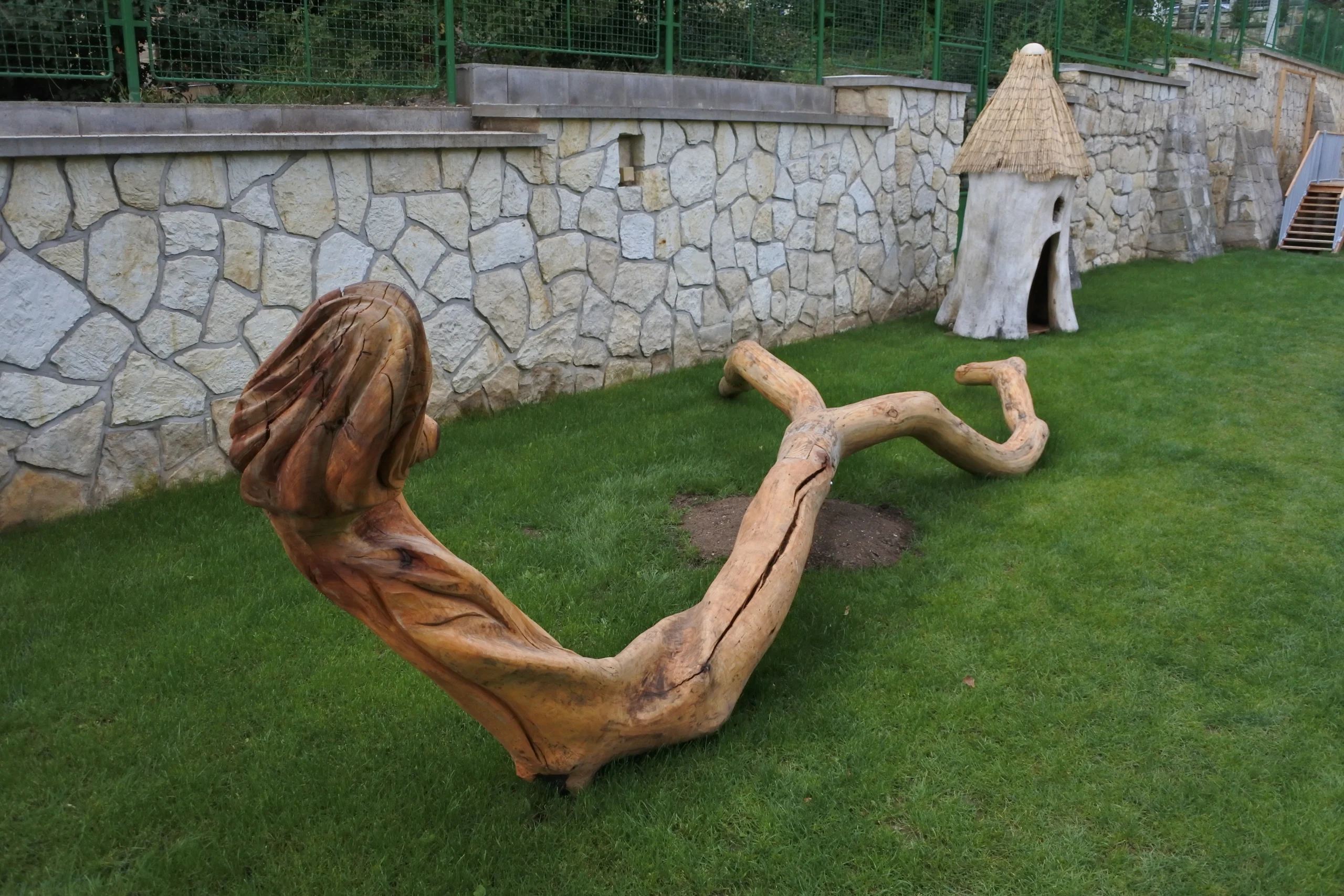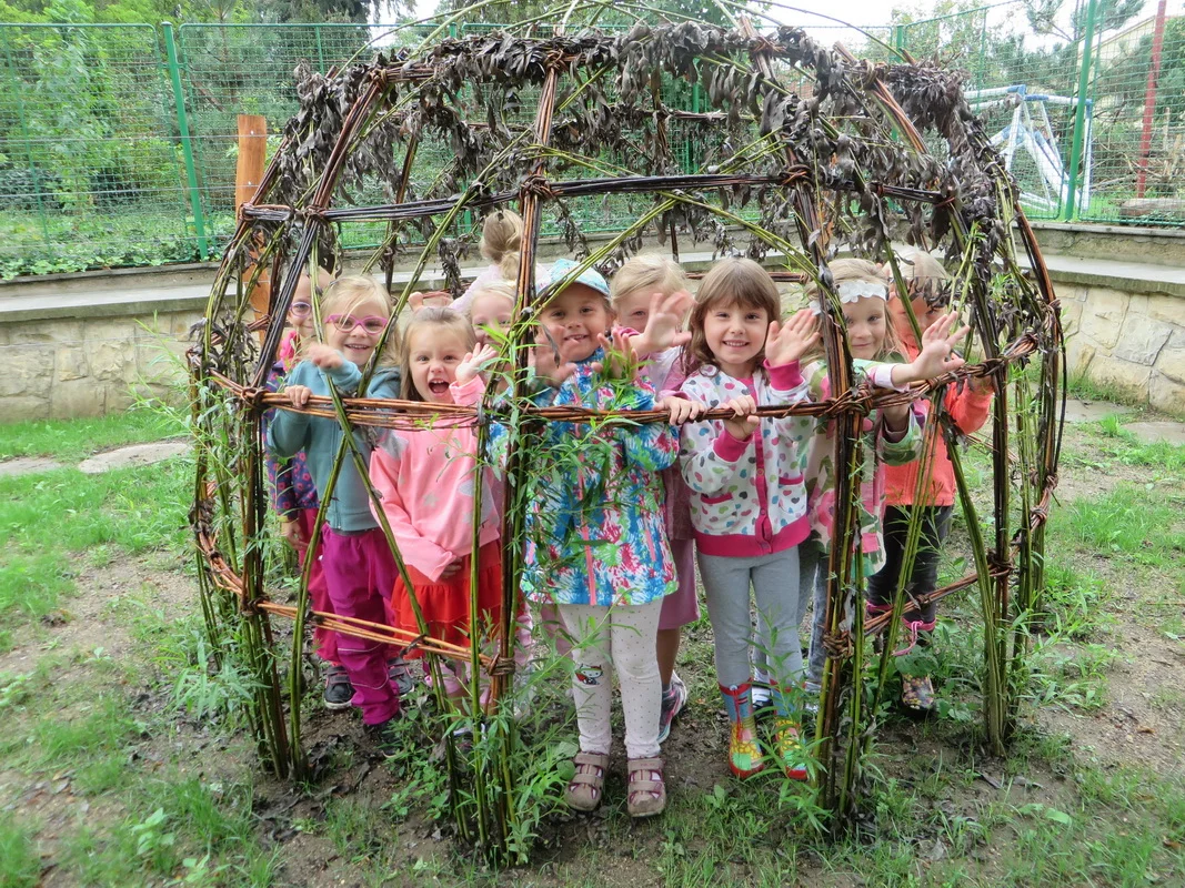We helped install a wooden snake in the garden, made from a tree trunk, set up wooden water troughs, and added seating around an old linden tree. We also emphasized the natural character of the garden. This is highlighted by the number of planted trees, the neutral colors of individual play elements, the choice of materials used, the flower house, bamboo nook, and beds for growing vegetables and flowers. Additionally, a large fire pit invites community gatherings on various occasions.