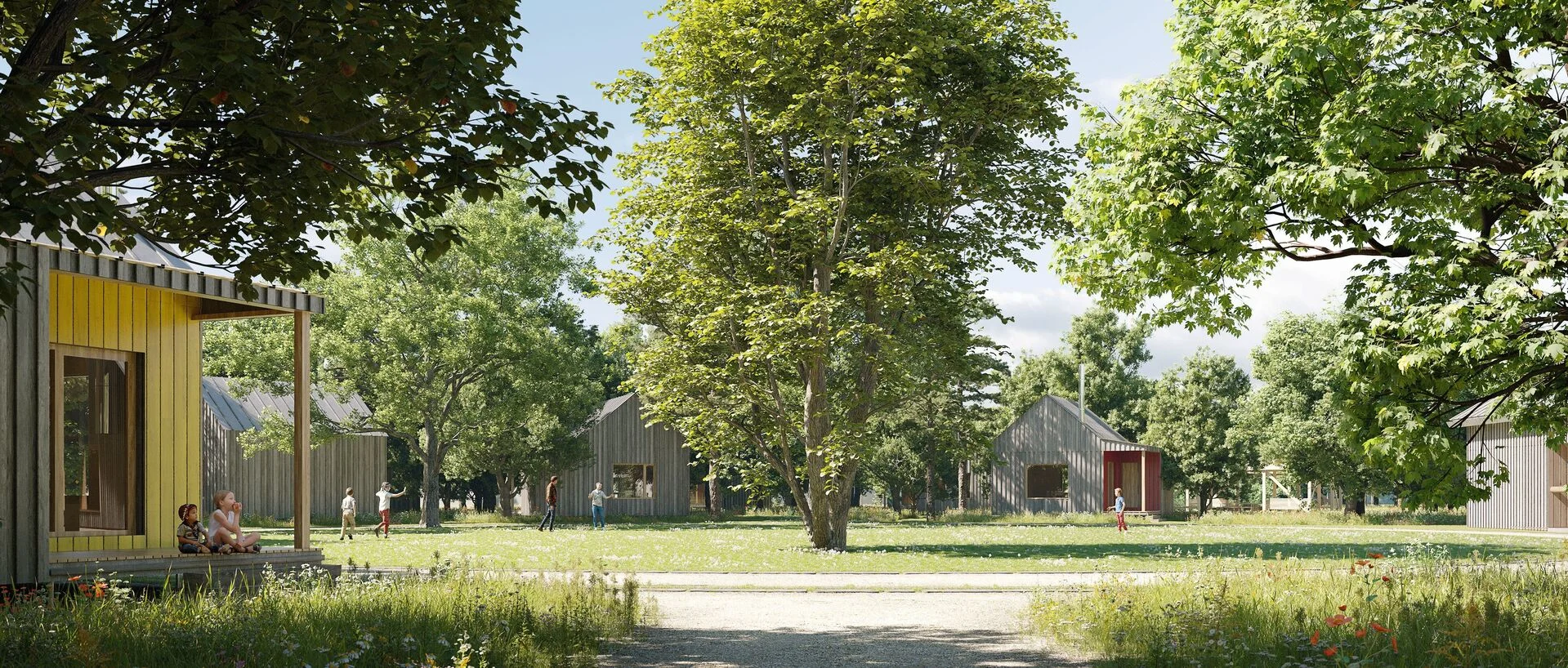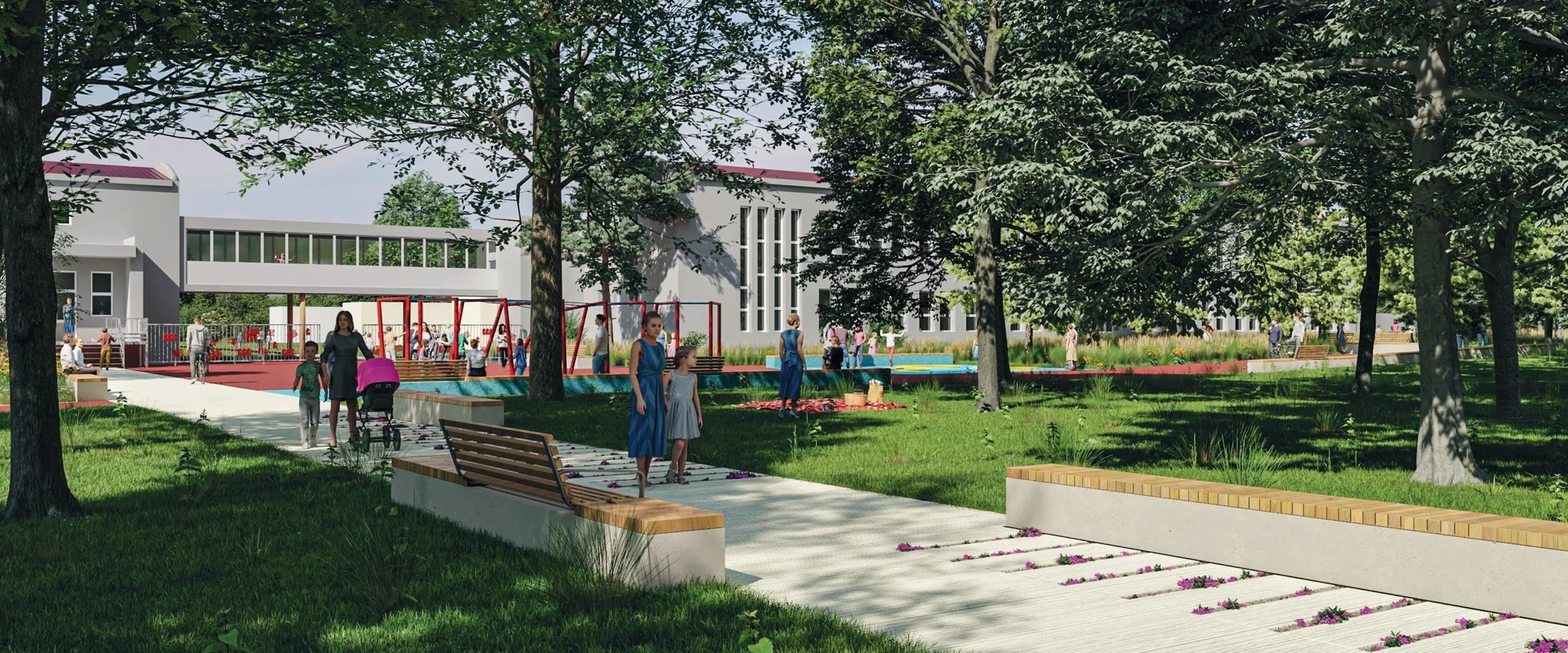 Před školou U Červených domků vytváříme nový hravý a odpočinkový prostor pro děti i dospělé. Najdete zde trampolíny, originální herní prvky, pískovou dunu i posezení mezi květinami. Naším cílem je proměnit okolí školy v příjemné místo pro všechny návštěvníky i obyvatele sídliště.