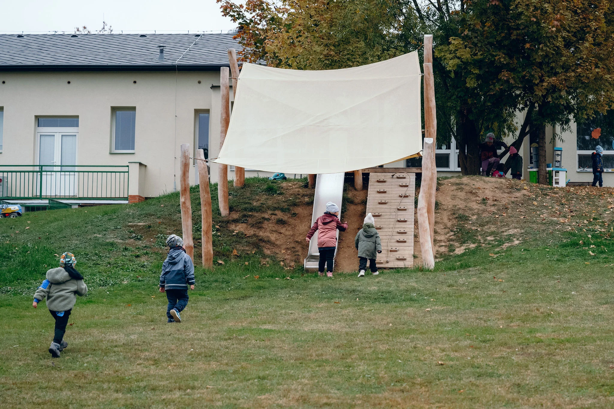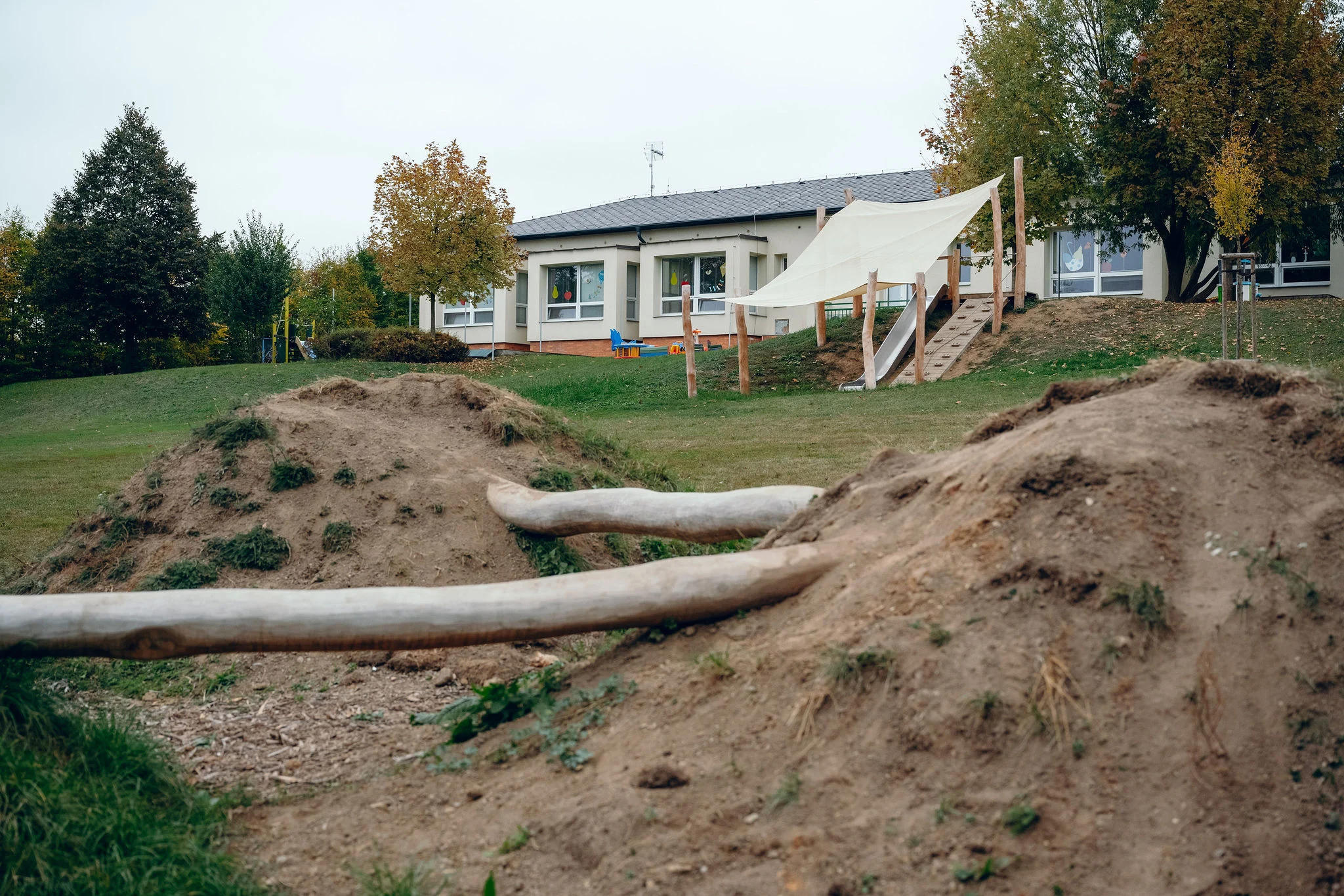 Předsíň, obývací pokoj, kuchyň, posluchárna, odpočívárna a dílna. Bývalou klášterní zahradu v nevelké obci u Prahy jsme pomohli ožít výukou a komunitními akcemi. Prostor jsme vybavili zařízením na zachytávání vody, chodníčky a posezením kolem stolu ve svahu. Pobyt na zahradě jsme dětem zpestřili prvky, jako je zvuková instalace, dešťová hůl, sestava sítí na lezení nebo skluzavka. Mohou se těšit také na to, že si na jaře konečně vyzkouší hmatový chodníček z přírodnin, luční labyrint nebo venkovní laboratoř.