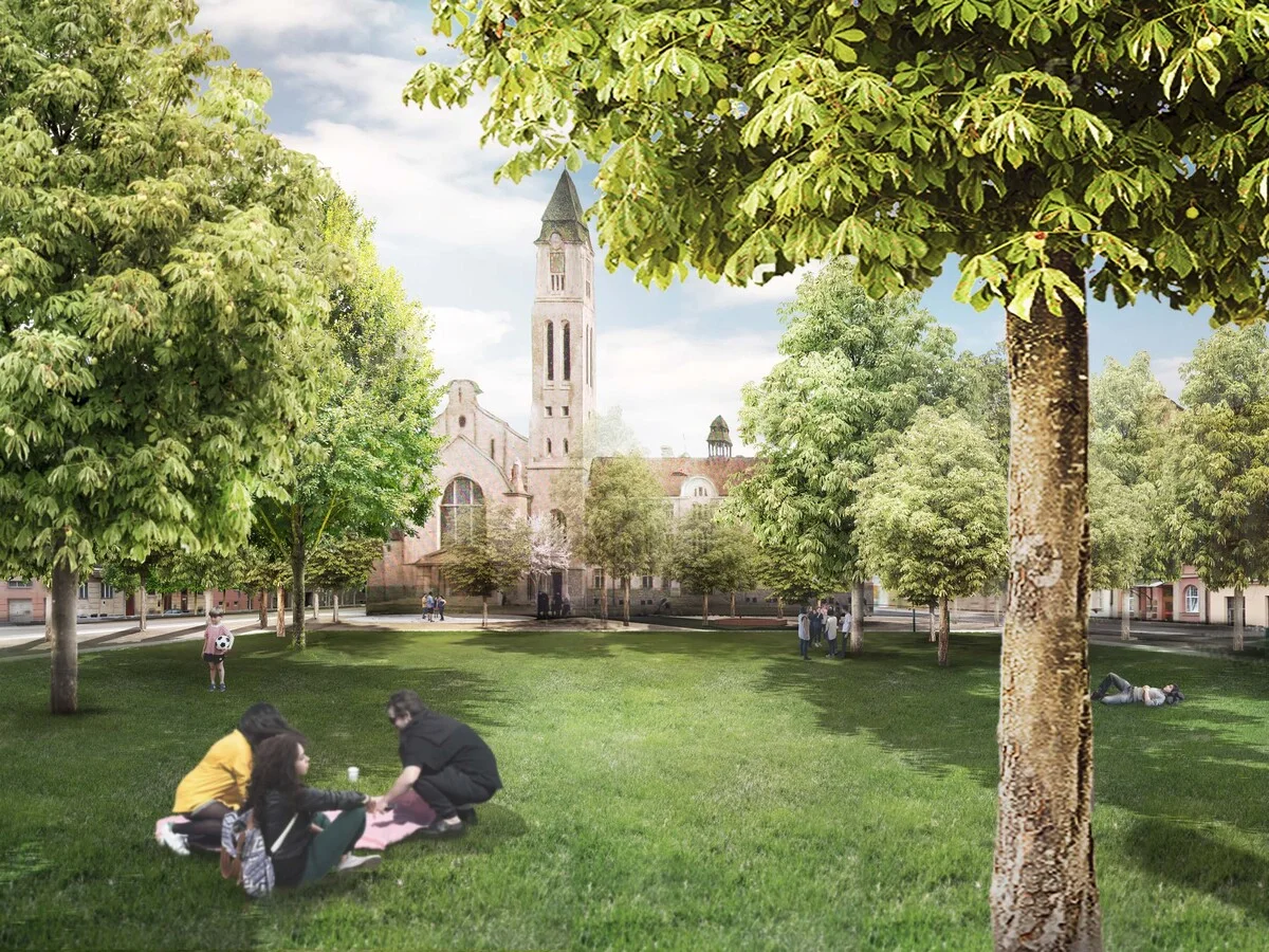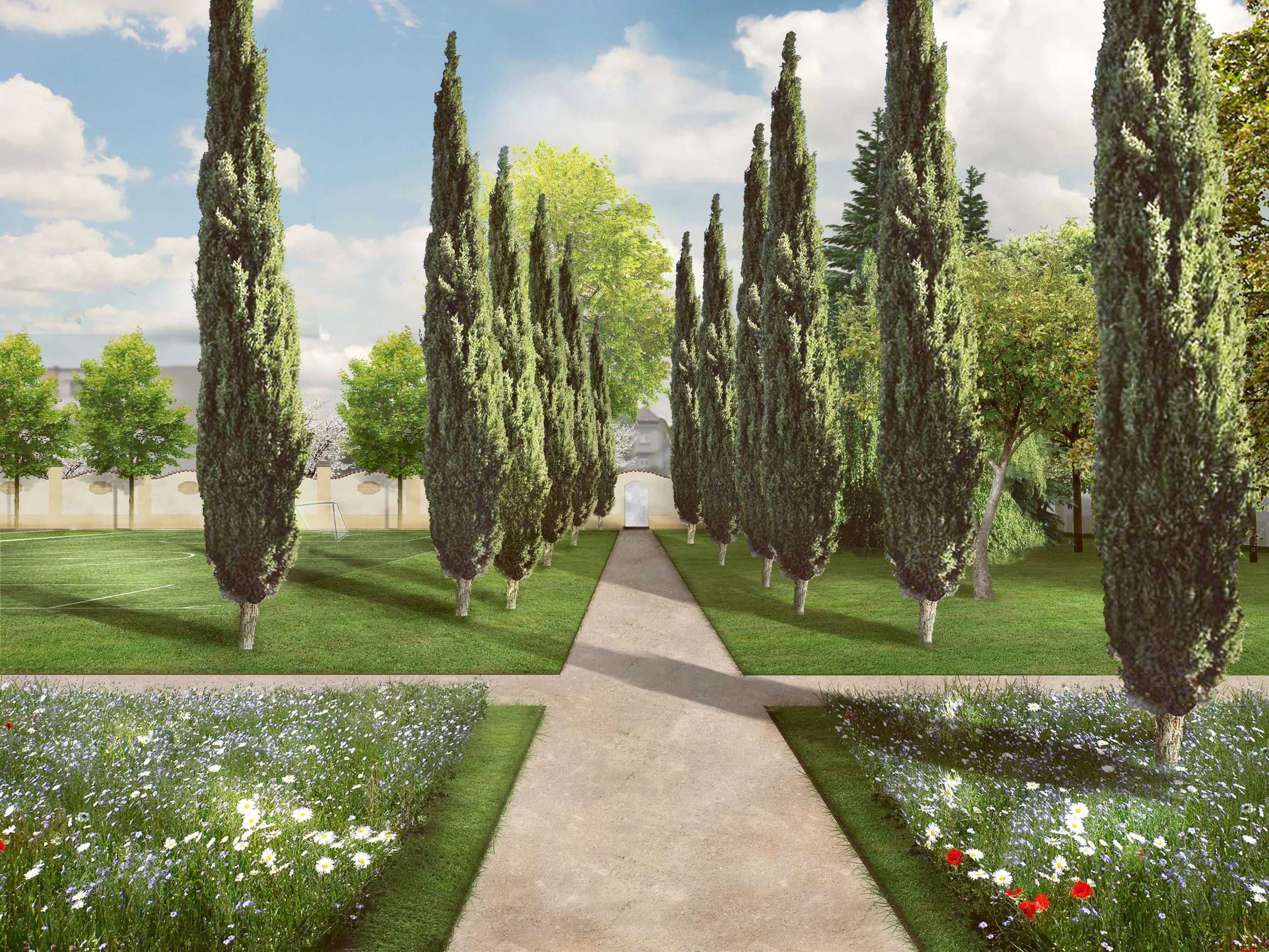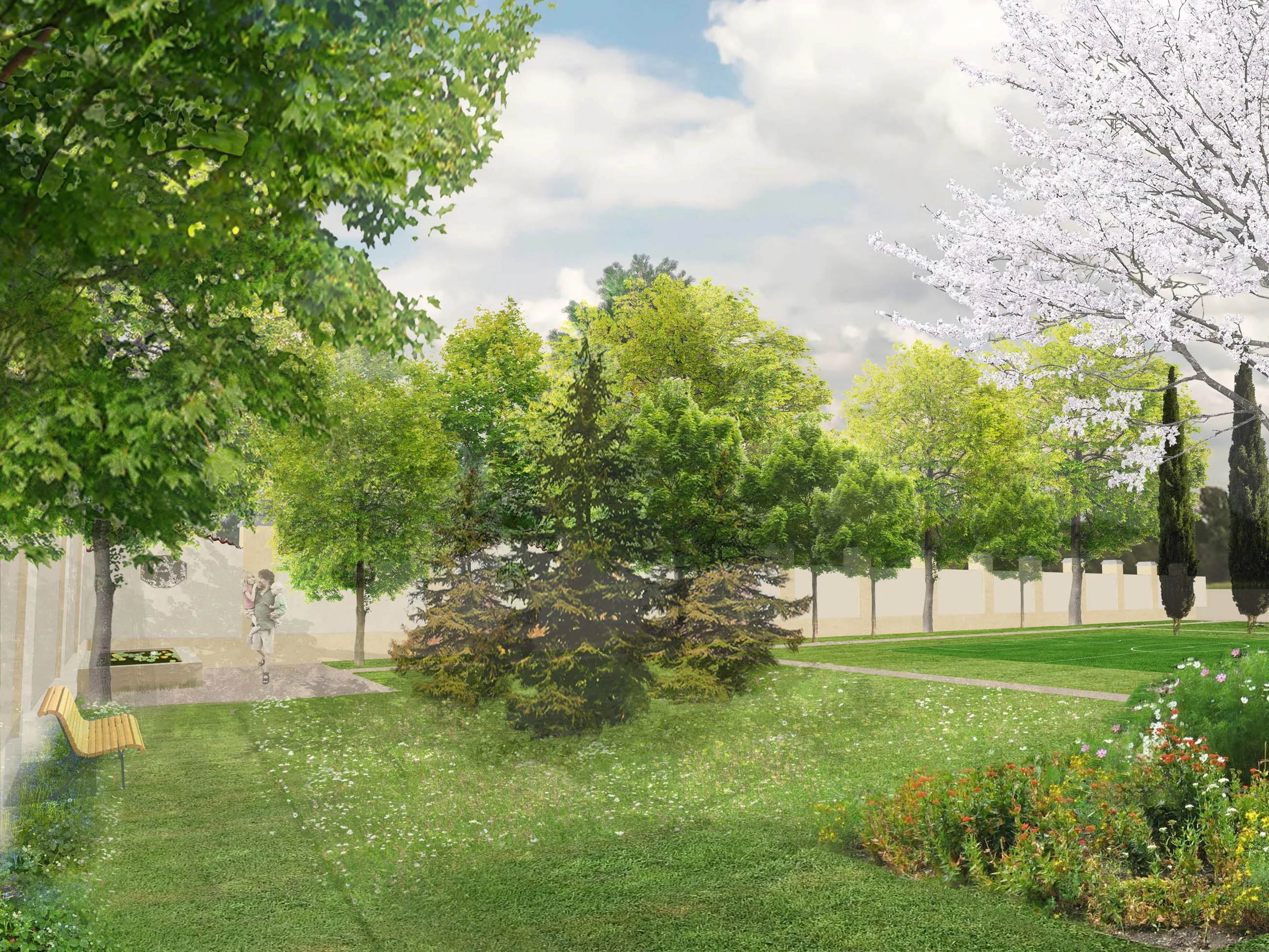 Klášterní zahrada se otevře veřejnosti a stane se tak plnohodnotnou součástí veřejného prostoru. Zahrada se rozčlení na několik částí pro lidi všech věkových skupin: travnaté hřiště pro sportovní vyžití, klidová zóna pro odpočinek, školní zahrada pro výuku, komunitní prostor pro setkávání místních. Klášterní zahrada, uzavřený a soběstačný svět, představuje kontrast k otevřenému a přístupnému náměstí a přilehlému parku.