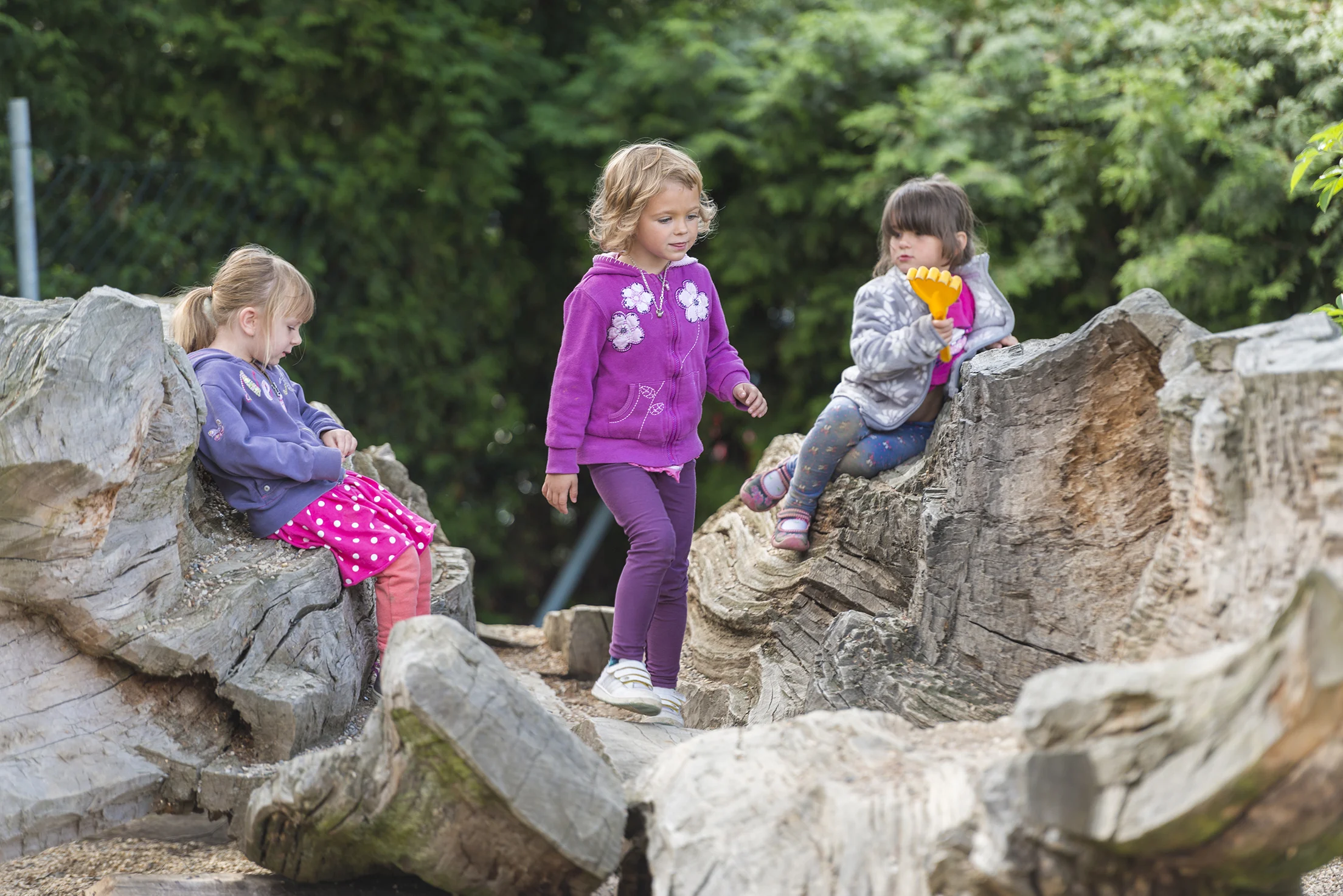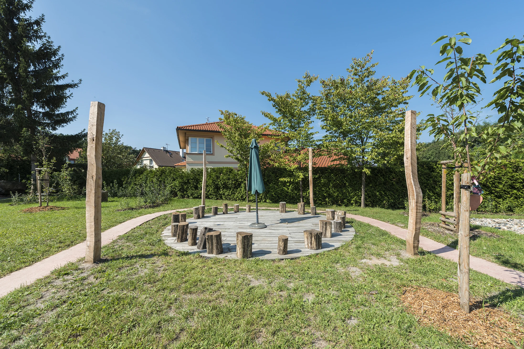 Prostor jsme rozdělili na čtyři zóny a každou z nich propojili s jedním živlem. Děti mohou s vodou, ohněm, vzduchem a zemí bezpečně experimentovat. Lidskou soudržnost a spojení člověka s přírodou a historií symbolizuje betonová stezka. Mokřad, jezírko a systém vodních korýtek vybízí děti k zahradním hrátkám s vodou a pozorování drobných živočichů.